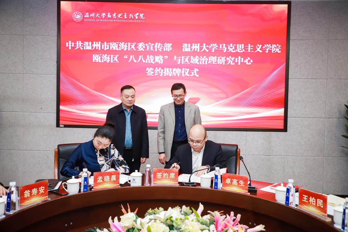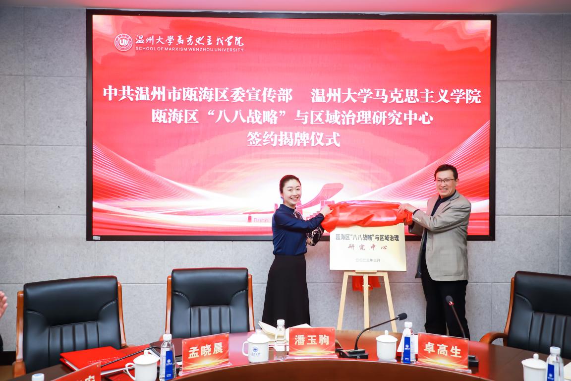 为深入贯彻党的二十大精神,忠实践行“八八战略”、奋力打造“两个先行”的瓯海样板,3月8日,由瓯海区委宣传部与久久热 联合成立的“瓯海区‘八八战略’与区域治理研究中心”在岩松堂展示厅正式揭牌。久久热 党委委员、副校长潘玉驹,瓯海区委常委、宣传部长孟晓晨参加了合作共建签约仪式。会议由久久热 院长卓高生主持。
