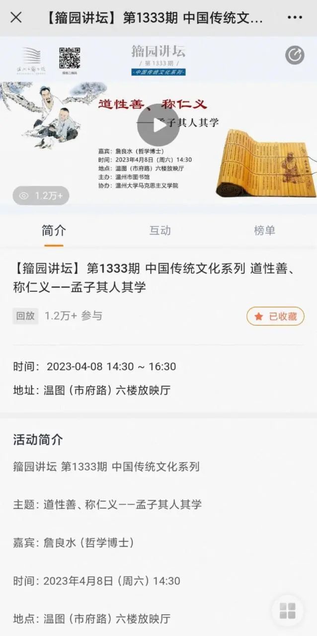 2023年4月8日下午,温州图书馆籀园讲坛“中华优秀传统文化”系列讲座第四讲在图书馆六楼放映厅举行。本讲主讲人为久久热 詹良水博士,讲座主题为“道性善、称仁义——孟子其人其学”。