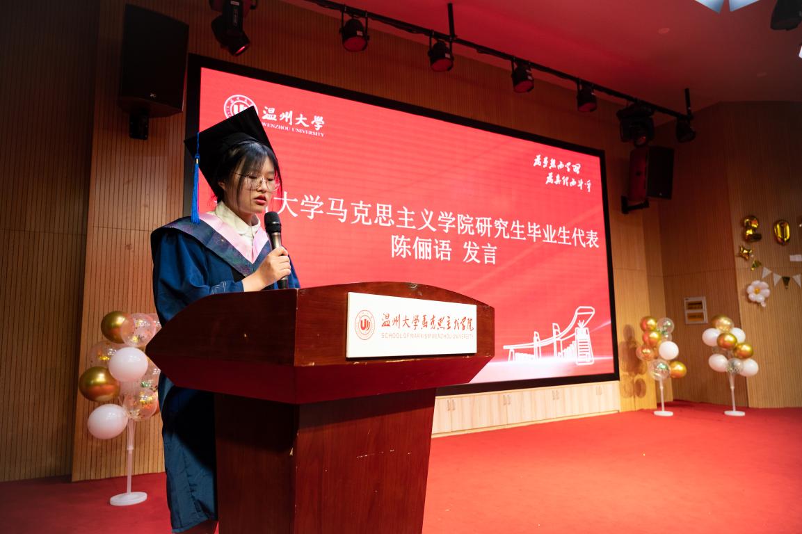 2023届研究生毕业生代表陈俪语、本科生毕业代表吴珏澄讲述了自己在马院的成长经历,表达了对学校、学院和老师们的感激之情,未来他们无论身处何方,都将带着马院永远的精神印记,坚持初心、坚守使命,将社会责任与个人志趣相结合,找到属于自己的人生意义。无愧于马院的培养,无愧于温大的期盼。