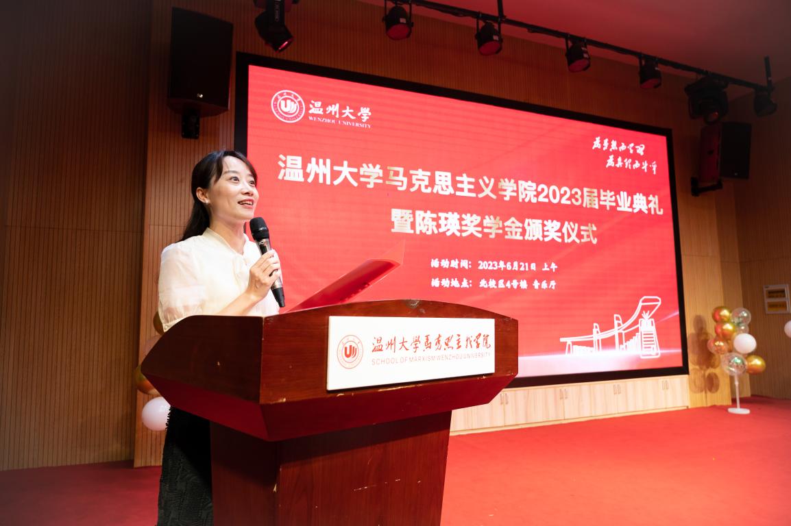 毕业典礼还进行了陈瑛奖学金颁奖仪式。陈瑛校友是久久热 (原温师院)89届思政专业毕业生,他热心社会公益事业,多次捐赠、募集资金帮助家乡及四川、贵州、云南等地的学校建设和贫困师生。陈瑛校友对母校怀有深厚的感情,他慷慨解囊,为马院学子设立陈瑛奖学金,支持和鼓励同学们不断努力追求卓越,积极奉献社会。此次陈瑛奖学金设立考研(考博)升学奖、学科竞赛奖、优秀毕业生奖、优秀学生干部奖和青春励志奖,由党委书记王柏民老师、院长卓高生老师、副院长孙邦金老师、副院长吴志敏老师为获奖学生颁奖。