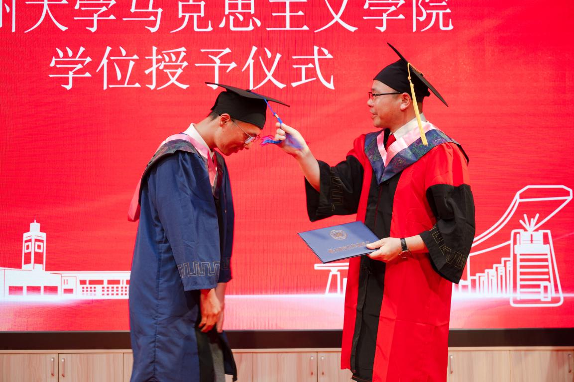 学士帽上的流苏从右侧拨到左侧,象征着学有所成,也标志着新的开始。卓高生院长为每一位毕业生拨穗正冠,祝贺同学们顺利毕业。
