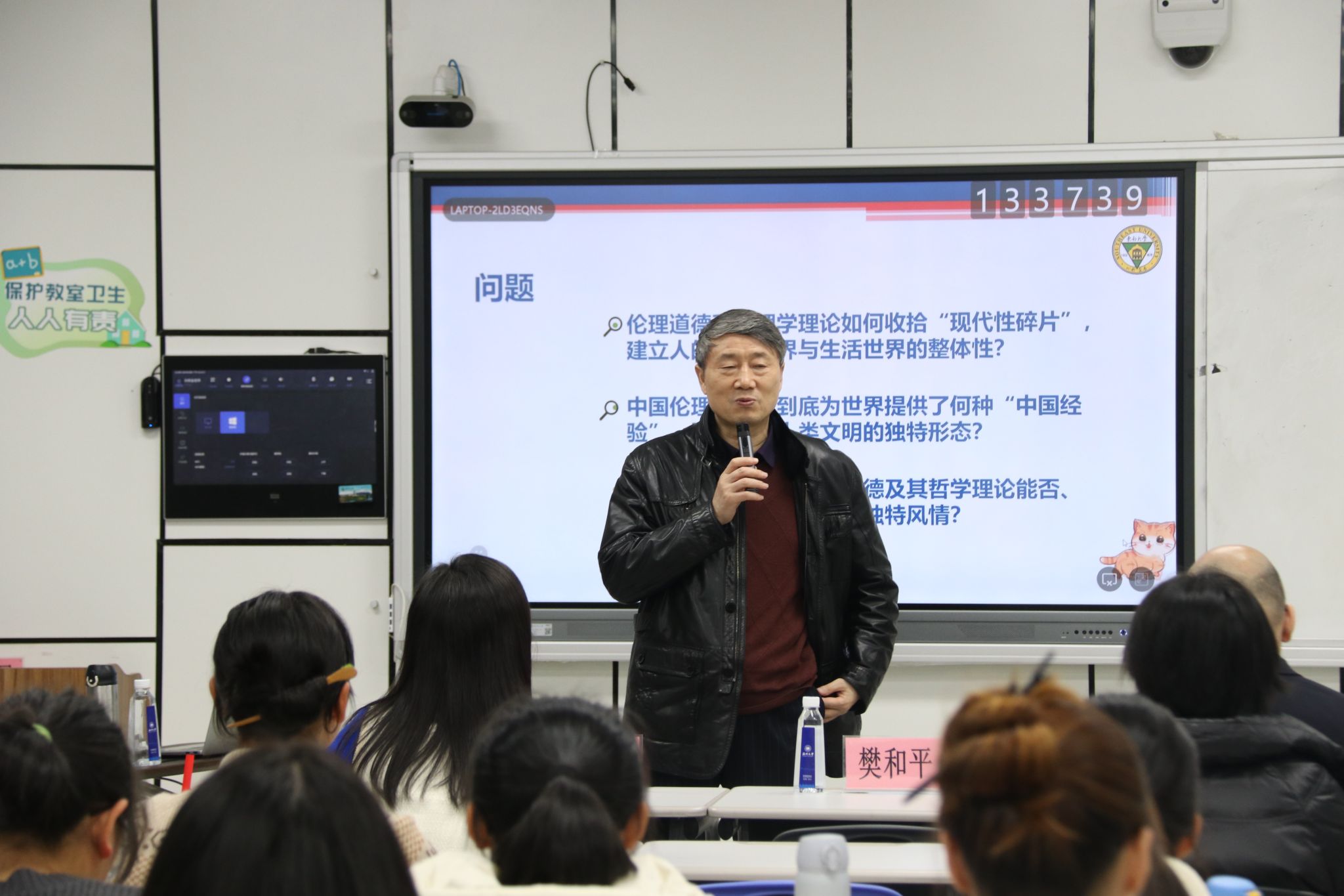 学术沙龙上半场,由樊浩教授主讲“伦理道德的精神哲学形态”。樊教授用中国“精神”传统体系和西方“理性”体系这两大精神哲学传统来引出此次讲座的主题。首先,樊浩教授指出中国的儒家与道家是传统伦理道德的双胞胎,随后指出儒家精神哲学形态是“伦理道德一体,伦理优先”,而当前新儒学的精神哲学体系是儒道佛、伦理与道德一体的自给自足的精神结构。其次,樊浩教授以康德、亚里士多德、柏拉图为例,讲述了西方伦理向道德的转变和中国伦理型文化为世界提供了“中国经验”。他提出,几千年来,中国学习借鉴西方伦理学,这表明了中国人走向世界的决心,了解世界的诚意。最后,樊浩教授指出了三种话语体系(伦理学、精神哲学、道德哲学)之间区别,说明了中国和西方宗教的发展区别,并向同学们推荐了代表性论著。他认为,中国人是在有宗教选项的背景下选择了不需要宗教,这正是因为中国有千年的伦理道德作为规范和精神支持。