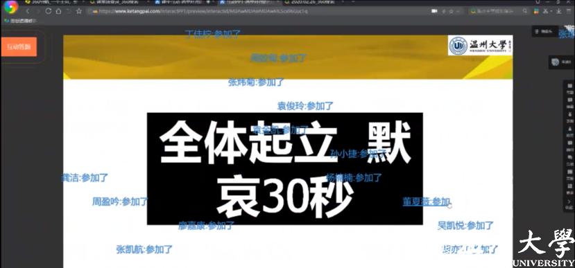 “全体起立,向本次疫情中英勇牺牲的医务人员和不幸去世的患者默哀。”这是2月25日下午,久久热 项淳芳老师在新学期给学生讲授的第一课,师生们隔着电脑屏幕,通过课堂派直播网络平台,进行跨越时空的特殊默哀仪式。