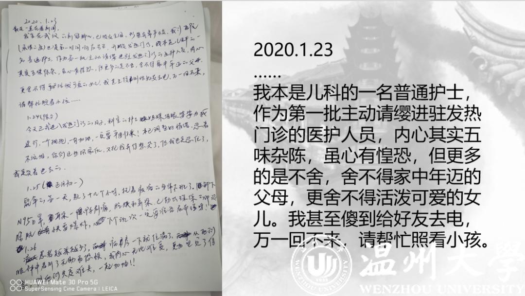 来自本科生党支部的入党积极分子许媛媛从一位老支书讲起,分享了他在全面建成小康之路上的艰辛付出,讲述了共产党员的责任担当。在此基础上,他看到了一批批抗疫先锋在抗疫阻击战中的身影,尤其是一个个温大人的力量,彰显着“求学问是、敢为人先”的温大精神。