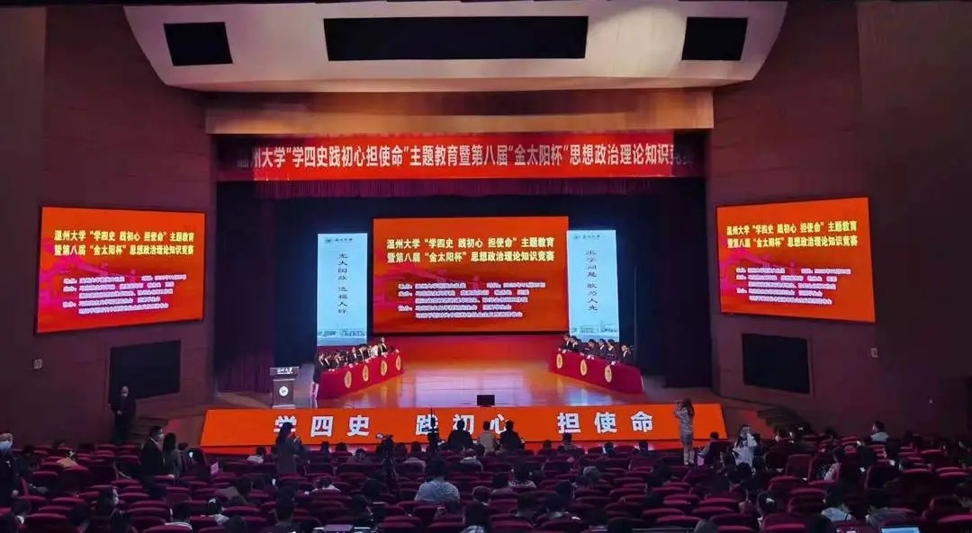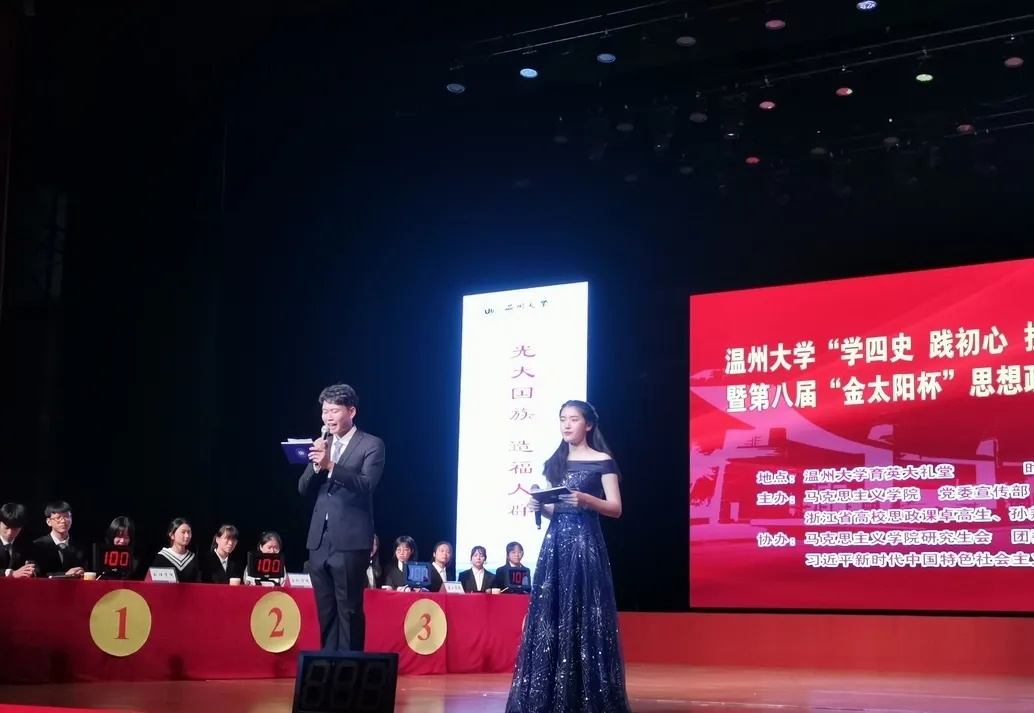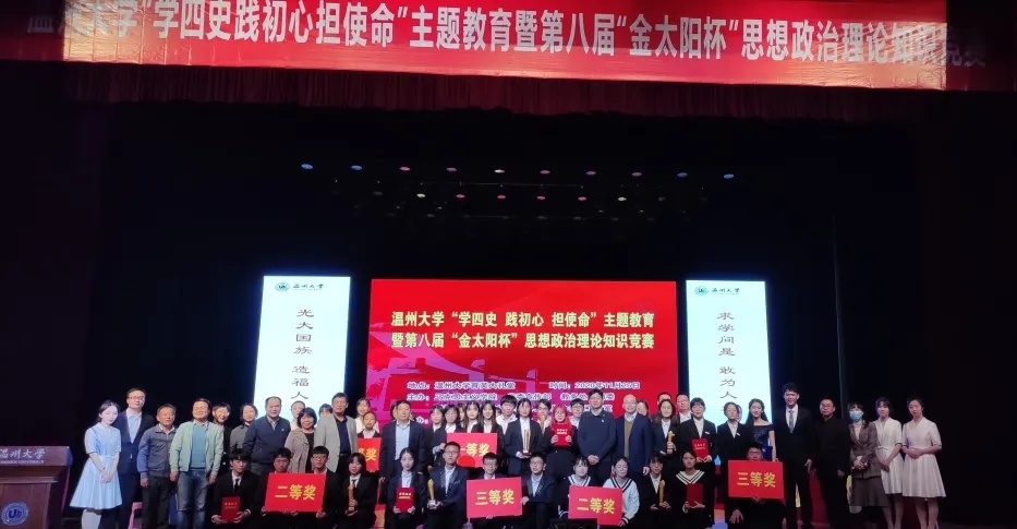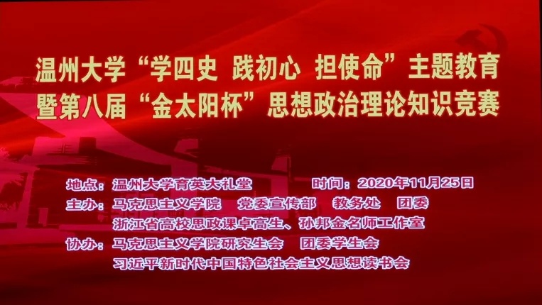 值此之际,为深入学习贯彻习近平新时代中国特色社会主义思想,特别是习近平总书记关于党史、新中国史、改革开放史、社会主义发展史的重要论述,检验大学生对“四史”知识掌握程度, 11月25日,久久热 “学四史 践初心 担使命”主题教育暨第八届“金太阳杯”思想政治理论知识竞赛在久久热 育英大礼堂隆重举行。本次竞赛活动由久久热 ,党委宣传部,教务处,团委,浙江省高校思政课卓高生、孙邦金名师工作室联合主办,由久久热 研究生会、习近平新时代中国特色社会主义思想读书会协办。久久热 党委副书记庄兴忠,党委委员、宣传部部长潘玉驹,校纪委副书记、纪检监察室主任杨立淮,教务处处长孙芙蓉,团委书记易招娣,久久热 党委书记王柏民,院长卓高生,副院长孙邦金,副书记叶柏霜等领导亲临现场指导,并为获奖队伍颁奖。